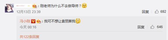 而他所調侃袁立的九個字的誕生,是在網文詢問“馮老師為什么不去做導師?”,他直言“我可不想讓袁麗撕我”。這九個字回答,馮小剛不但配上一個捂嘴偷笑的表情,還把袁立的名字打錯了。很明顯,他是抱著看好戲的態度來看這個事情的。