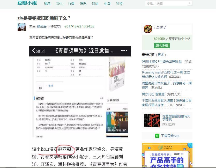 帖子標題為“ZLY是要學她拍職場劇了么?”,內文稱趙麗穎將拍攝一部職場劇,并附上了“實錘”截圖。